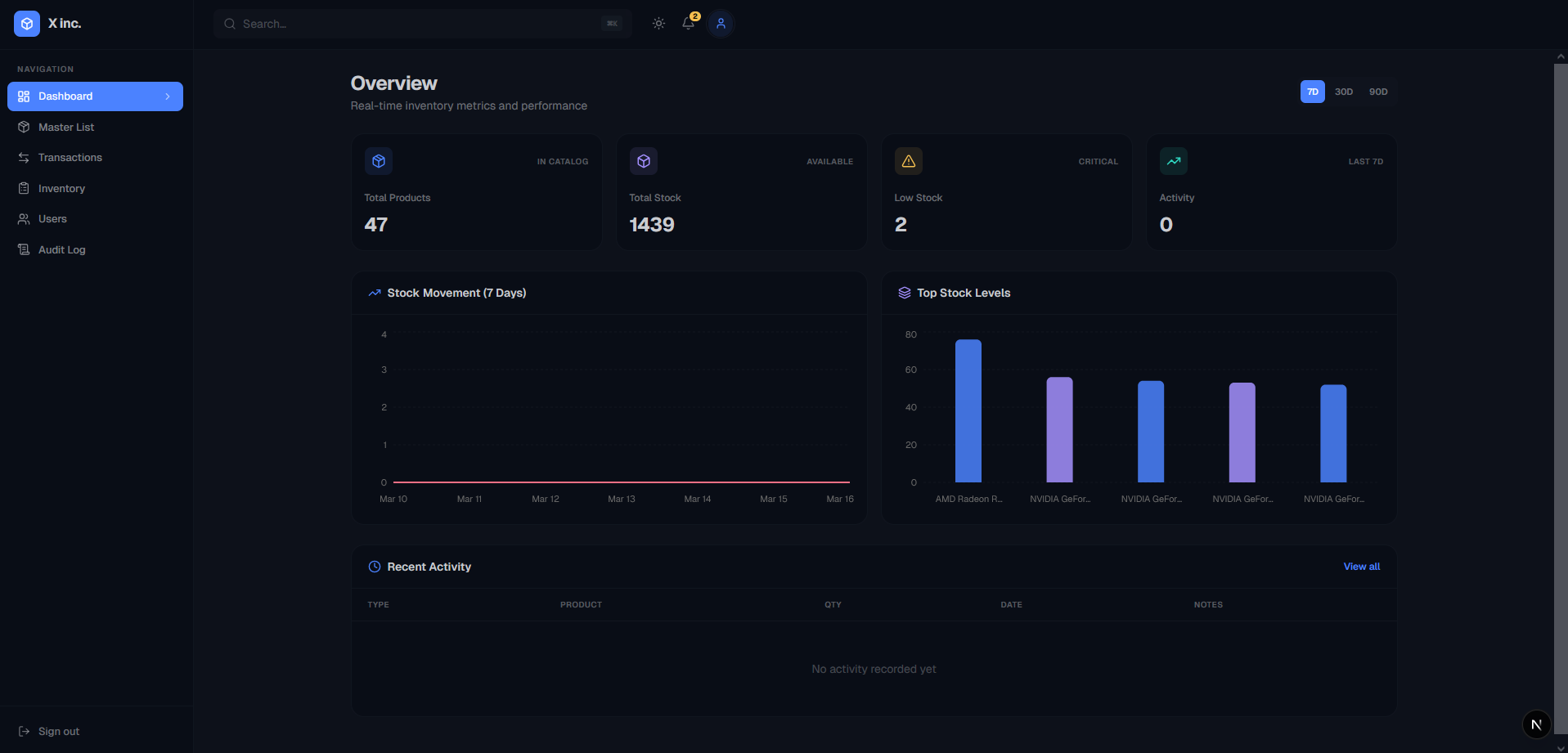 A SaaS inventory management platform with analytics, authentication, and a PostgreSQL backend.